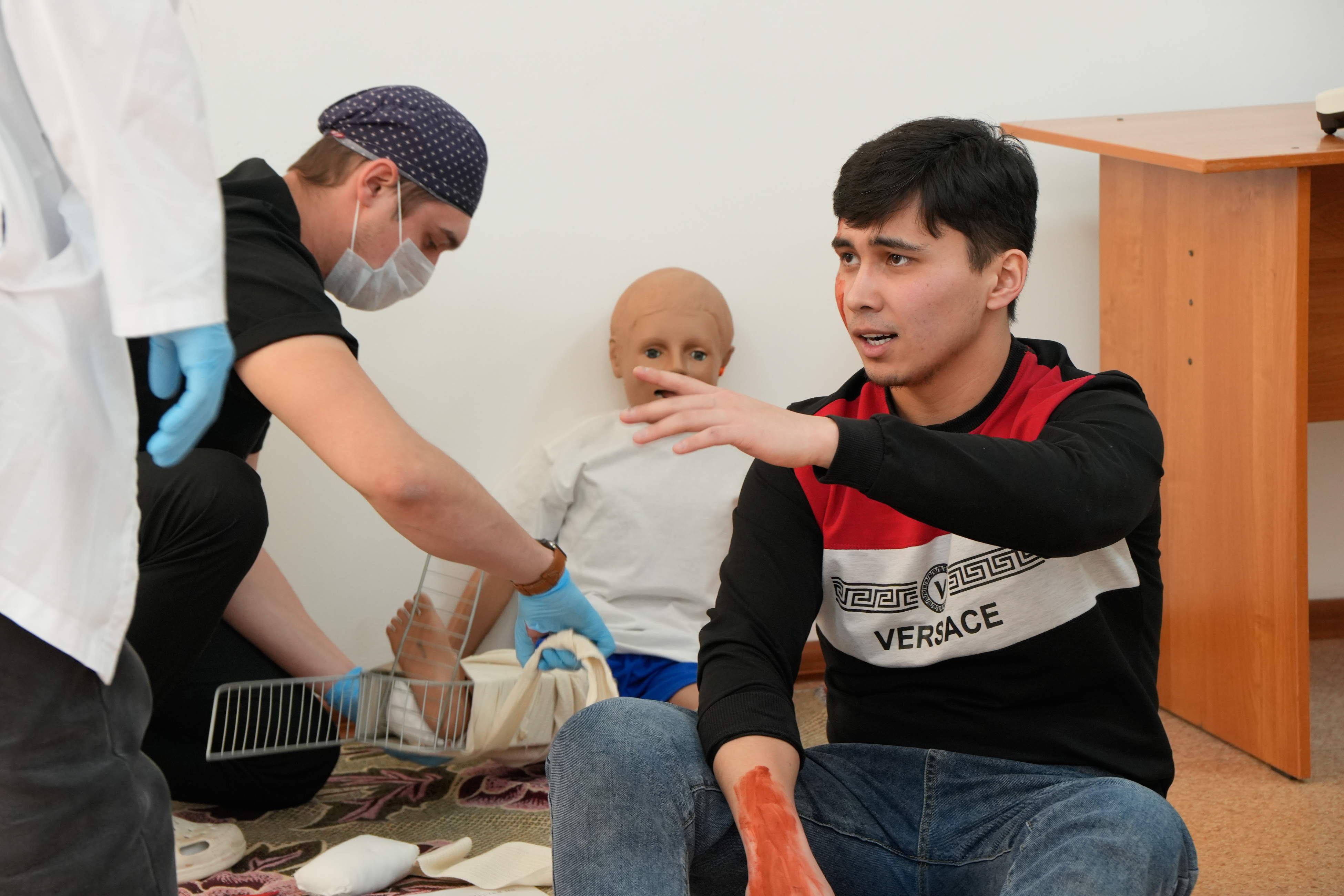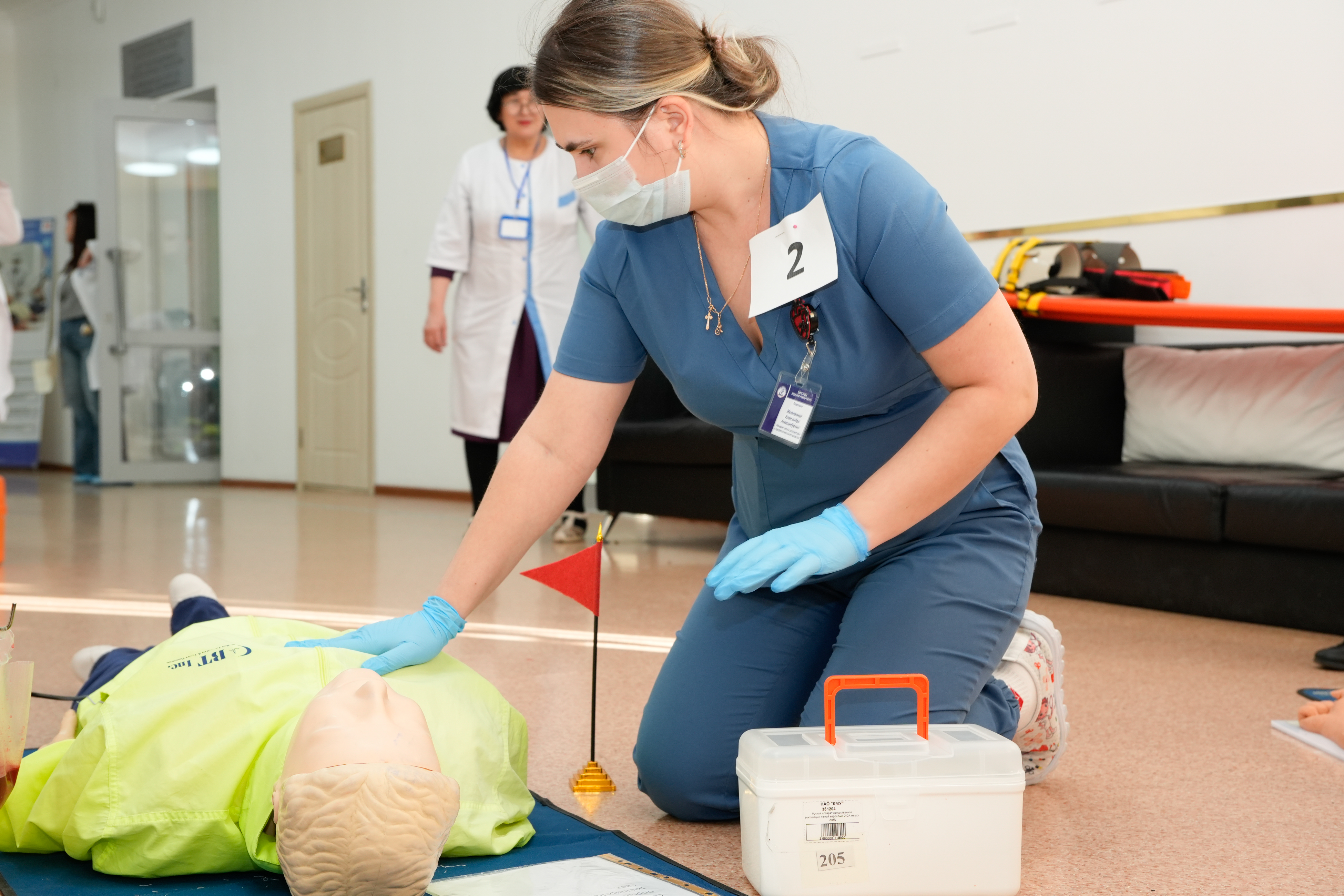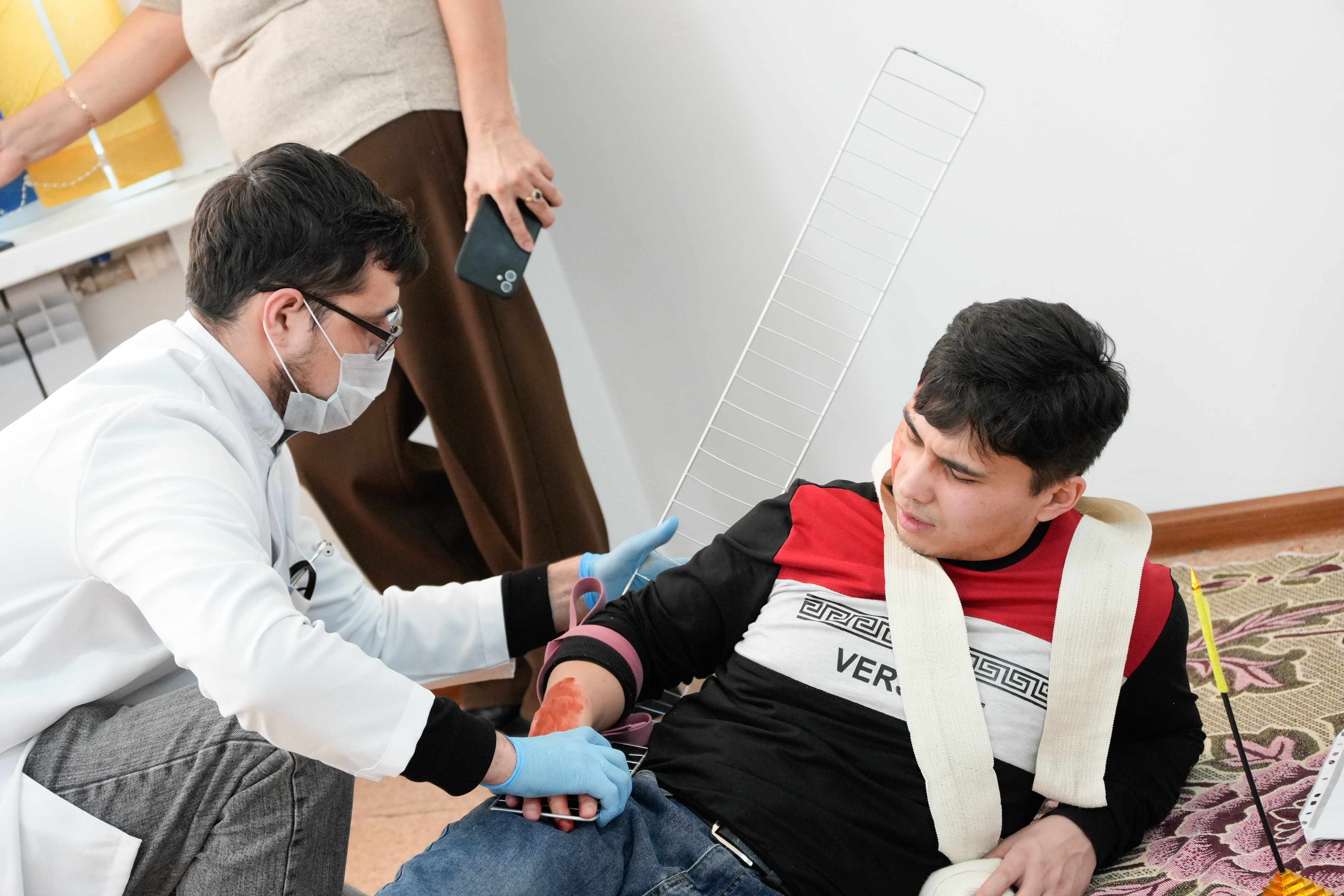 Six teams took part in the competition, each consisting of 5–6 medical residents. According to the scenario, a road traffic accident occurred on the Karaganda–Karkaralinsk highway involving a crash between a motorcyclist and a passenger minibus (“GAZelle”). An emergency response team, including medical residents, arrived at the accident scene to provide rescue emergency care, conduct sorting, and organize the subsequent transportation of the injured.