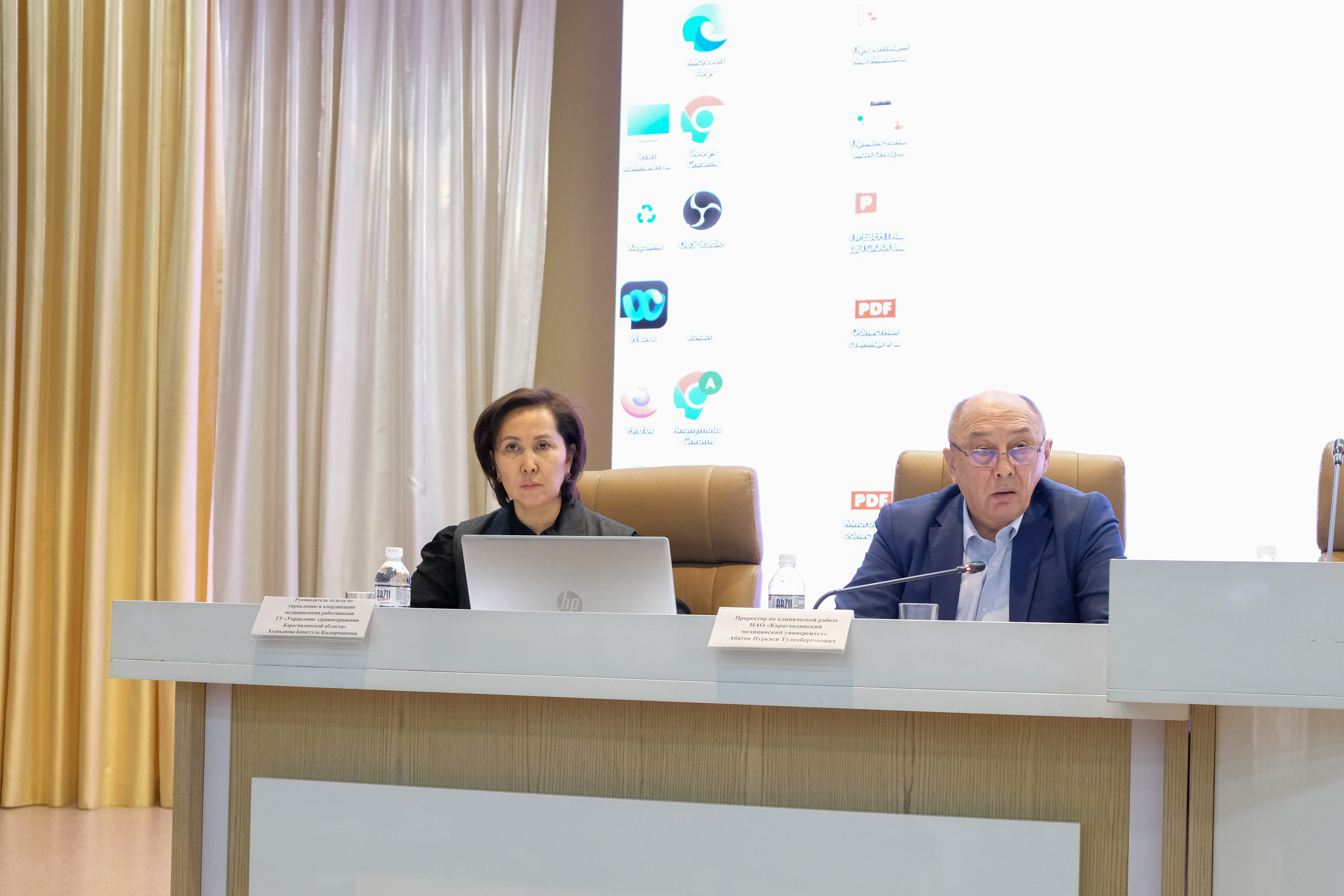 Қарағанды облысының Денсаулық сақтау басқармасы атынан басқарма басшысының орынбасары Оспанова Лейла Темірбайқызы және медициналық кадрларды үйлестіру бөлімінің басшысы Қуанышова Бахитгүл Қыдырманқызы баяндама жасады. Олар өңірдегі кадрлық жағдайға жан-жақты тоқталып, сұранысқа ие медициналық мамандықтарды атап өтті, денсаулық сақтау саласының басым бағыттарын таныстырды, сондай-ақ түлектерге қолжетімді бос жұмыс орындары туралы ақпарат берді. Ерекше назар еңбек жағдайларына, мемлекеттік және әлеуметтік қолдау шараларына, сондай-ақ жас мамандарды медициналық ұйымдарда кәсіби тұрғыда бекіту мүмкіндіктеріне аударылды.